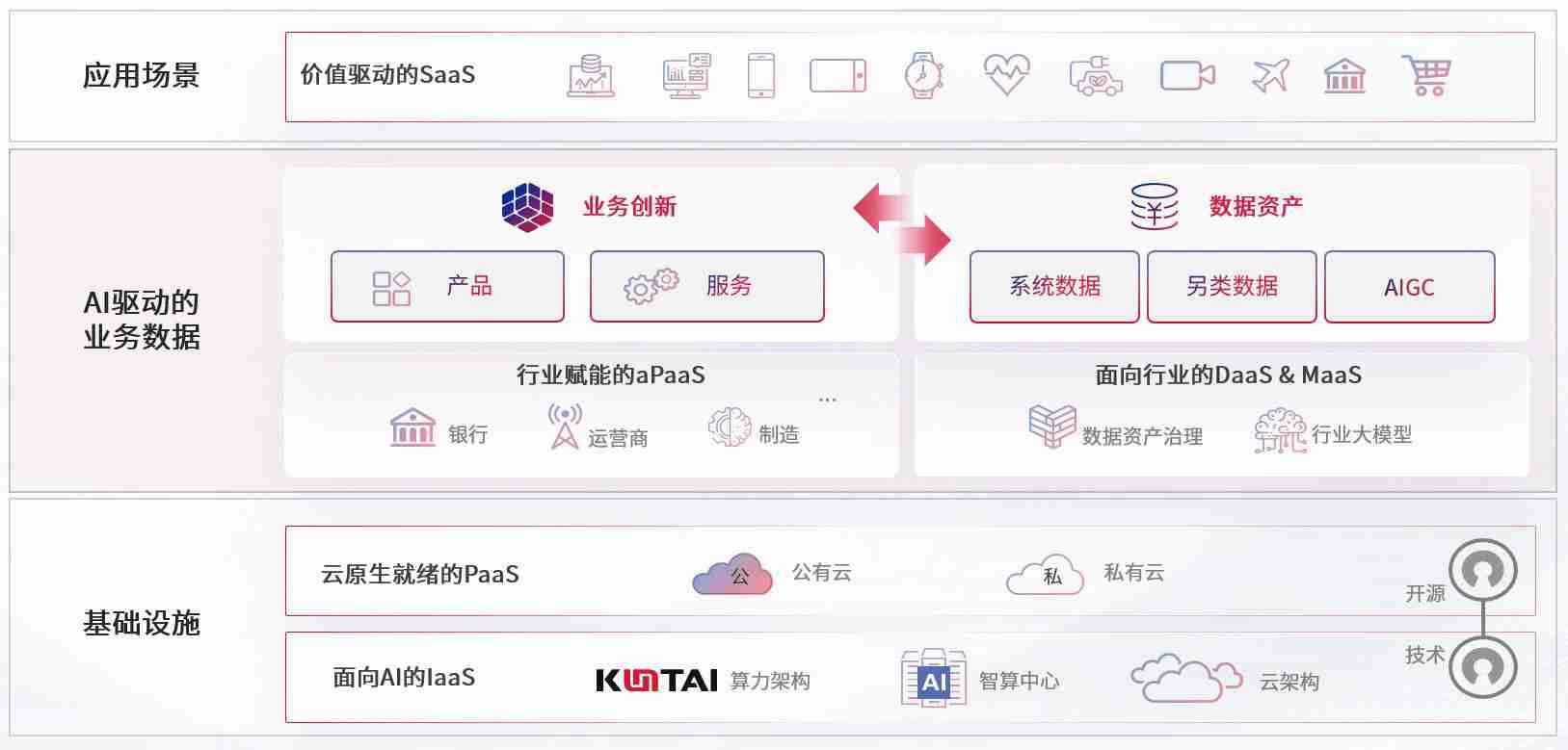 数字时代,,围绕企业数字化转型的关键要素,,,,PA旗舰厅数码开创性的提出数云融合战略和技术体系框架,,,,着力在云原生、、、、数字原生、、、、AI原生和信创产业上架构产品和服务能力,,,,为处在不同数字化转型阶段的快消零售、、汽车、、、金融、、、、医疗、、、、政企、、、、教育、、、、运营商等行业客户提供泛在的敏捷IT能力和融合的数据驱动能力,,构建跨界融合创新的数字业务场景和新业务模式,,,助力企业级客户建立面向未来的核心能力和竞争优势,,全面推动社会的数字化、、智能化转型升级。。