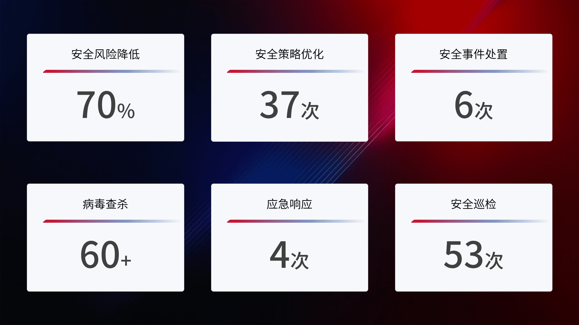 提供全面的安全事件报告体系,,,,包括处置报告、、周报、、、季度和年度总结,,结合持续监控,,,帮助客户深入了解网络安全状况。。。。