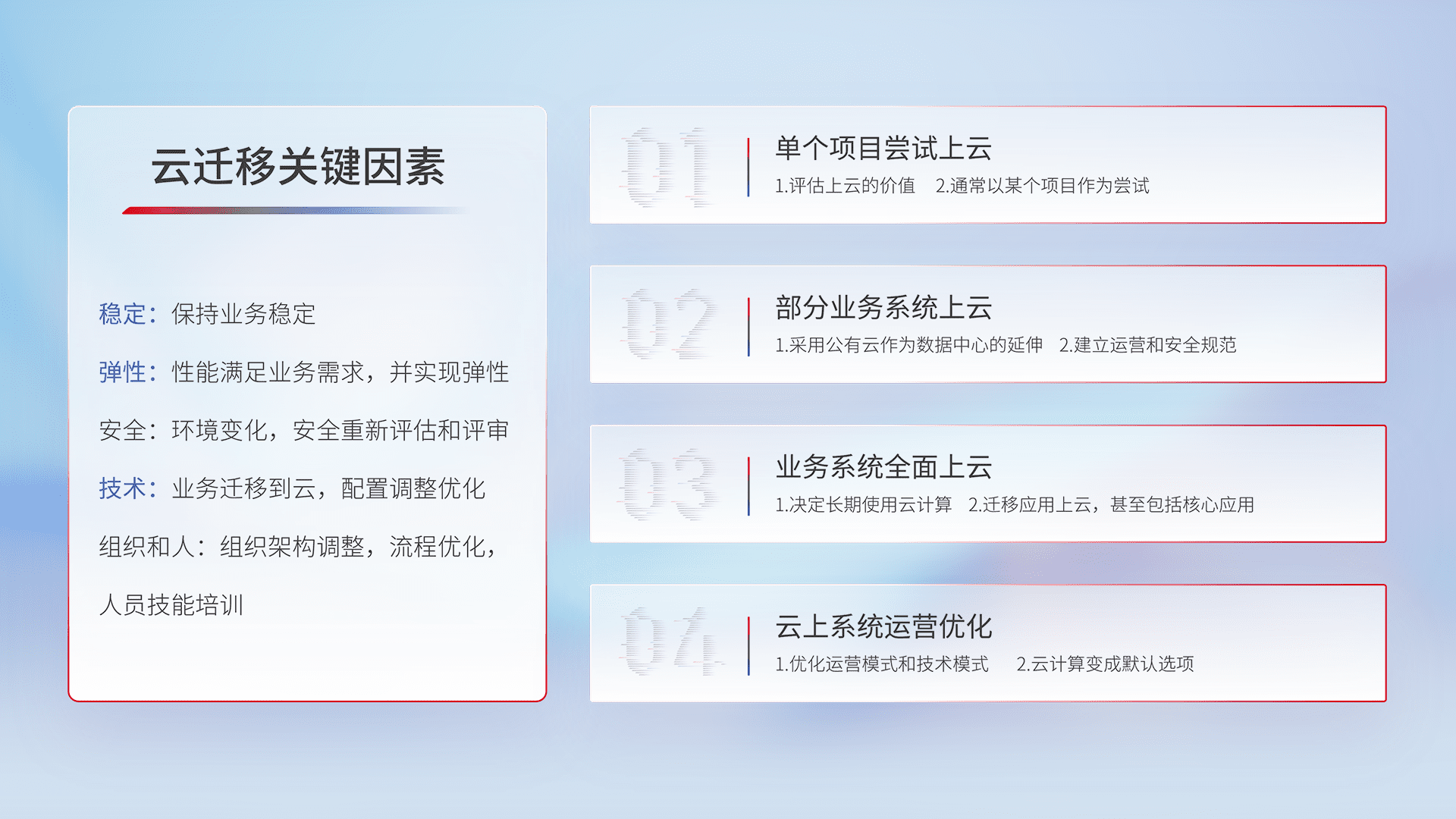 结合实际业务,,,,从规划设计、、、云平台选型、、、云原生改造、、数据迁移、、、集成交付,,迁移全过程为客户识别最佳上云路径,,,做好风险识别管理,,,设计网络架构、、、、身份权限、、、、安全审计合规、、操作审计、、日志审计、、、、监控告警策略、、、、多站点容灾设计等,,,,对云上基础设施进行整体规划,,,提升IT治理水平,,以满足弹性、、、高可用、、、、高性能的需求。。