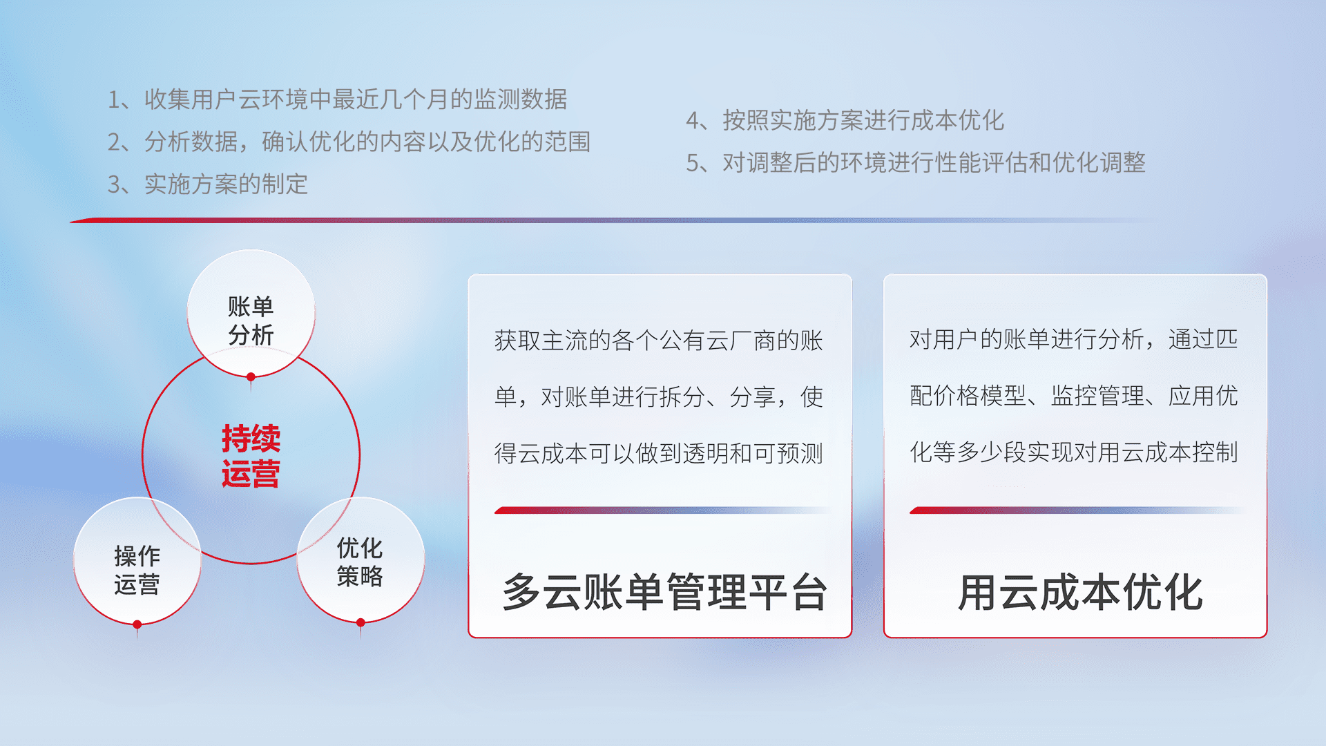 通过灵活运用多种自动化迁移工具,,,,帮助企业用户实现业务和数据高效 、、、、稳定的上云迁移和云上迁移,,,,采用自研多云纳管平台,,以中立管理模式,,,,解决多组织、、、、多云、、、、多运维厂商的复杂关系的管理,,保证多云平台资源配置的一致性,,,实时掌控云资源运行数据,,运用智能化工具分析云资源多云平台的管理服务,,,,透明化管理成本支出,,用云成本可预测、、、用云费用可优化、、云资源配额有据可依。。